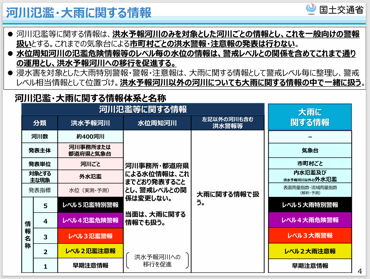 - 河川氾濫の「特別警報」(レベル5氾濫特別警報)を新設。