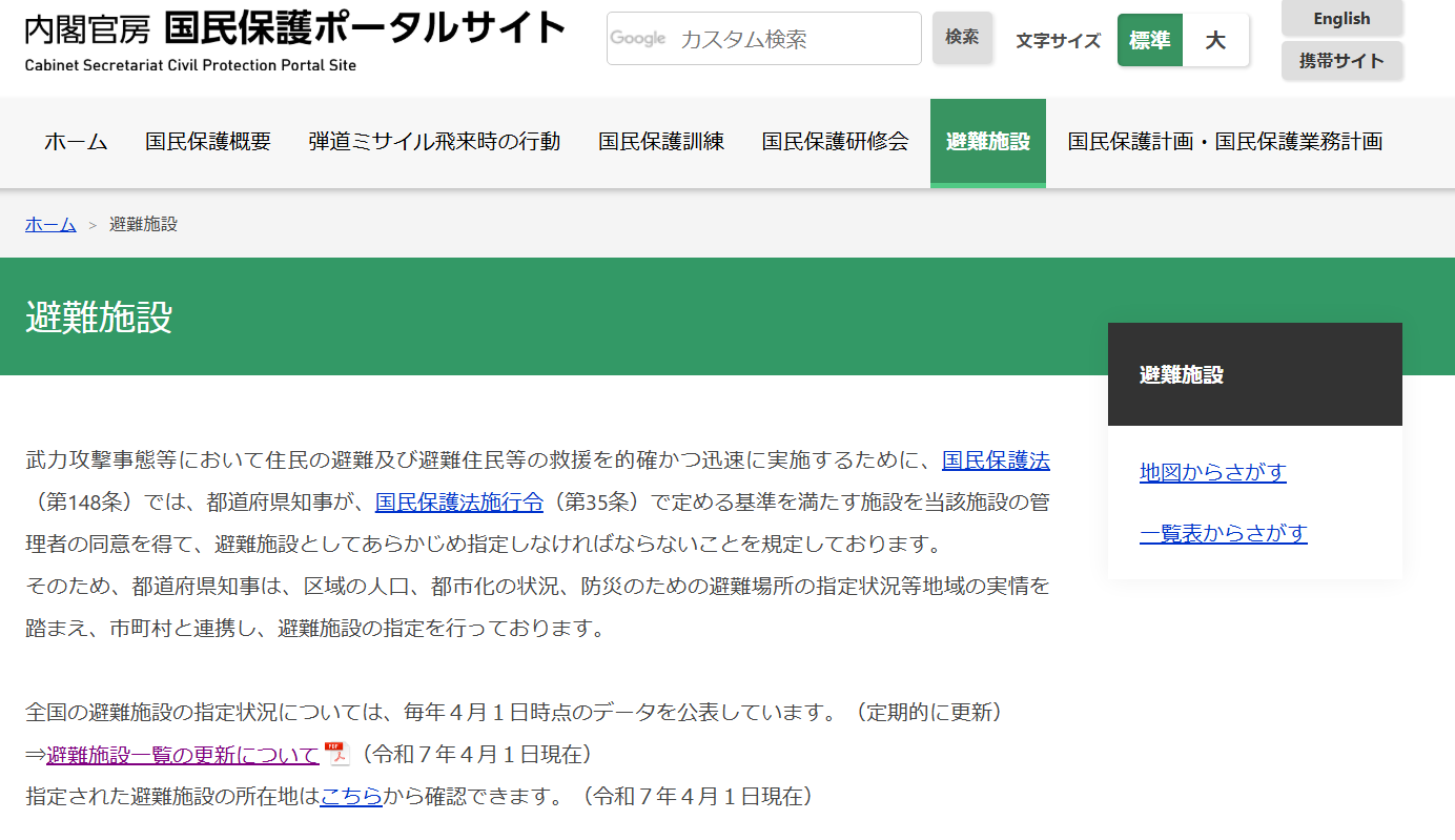 国土交通省の防災ポータルサイトで、「避難への備え」という欄の中に、「避難施設(内閣官房 国民保護ポータルサイト)というのが見れるはずです。↓