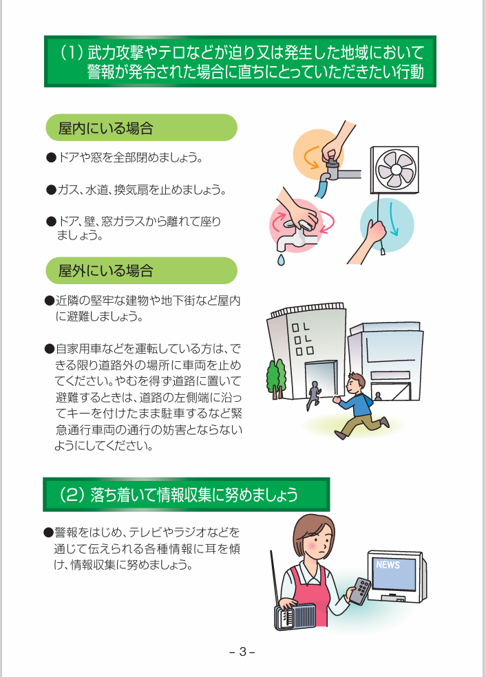 パンフレット「武力攻撃やテロなどから身を守るために ~避難にあたっての留意点~」は、